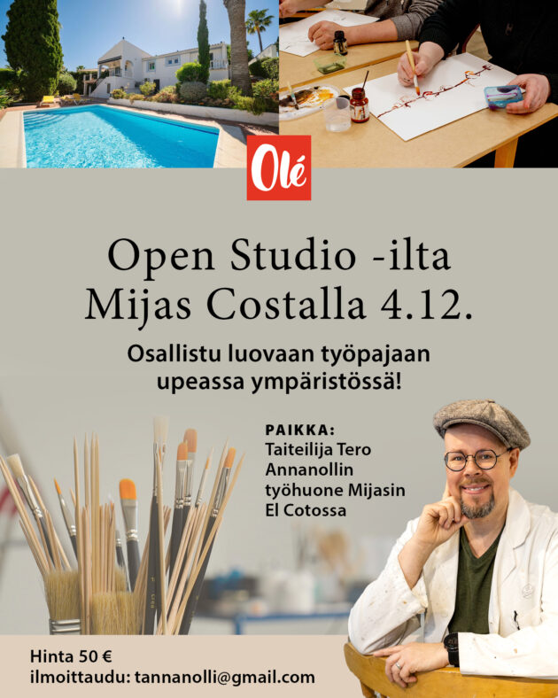 Olé-lehden lukijoille avautuu harvinainen tilaisuus astua taiteilija Tero Annanollin luovaan maailmaan. Mijasin Open Studio -illassa pääsee seuraamaan taiteen syntyä ja osallistumaan ohjattuun työpajaan – lämpimässä, jouluisessa tunnelmassa.