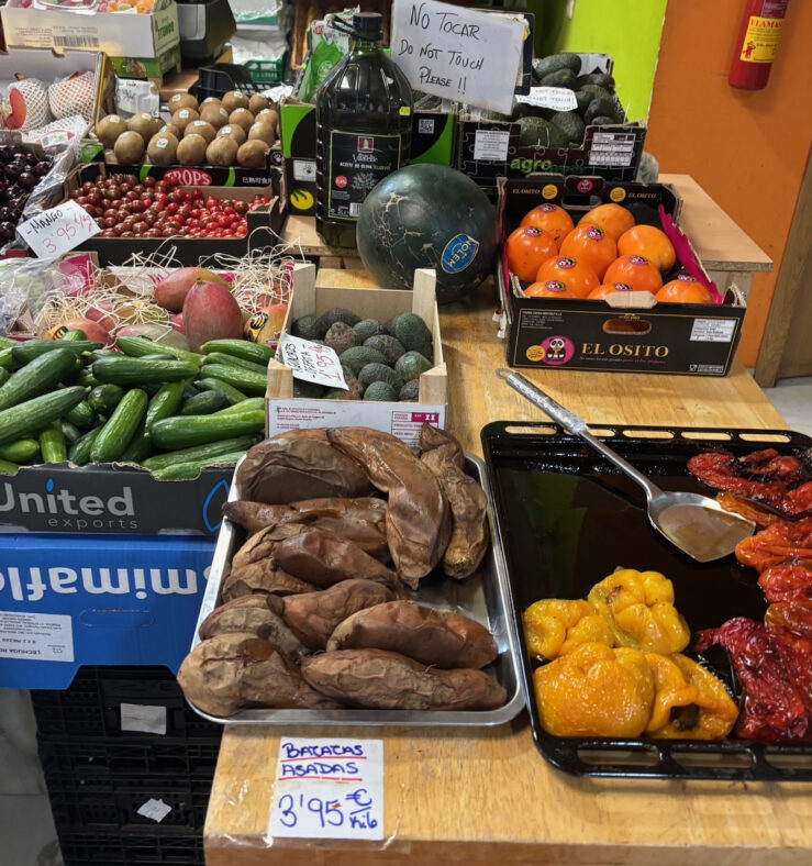 Hedelmäkaupoissa saa tuoreiden hedelmien ja vihannesten lisäksi usein jo valmiiksi kypsytettyä uunibataattia eli batata asada.