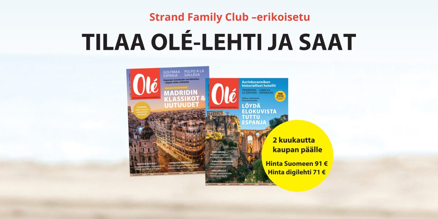 Hyödynnä Strand Family Clubin jäsenille tarkoitettu erikoisetu ja tilaa Olé-lehti itsellesi. Olé tarjoaa ajankohtaista tietoa, vinkkejä ja elämyksiä Espanjasta.