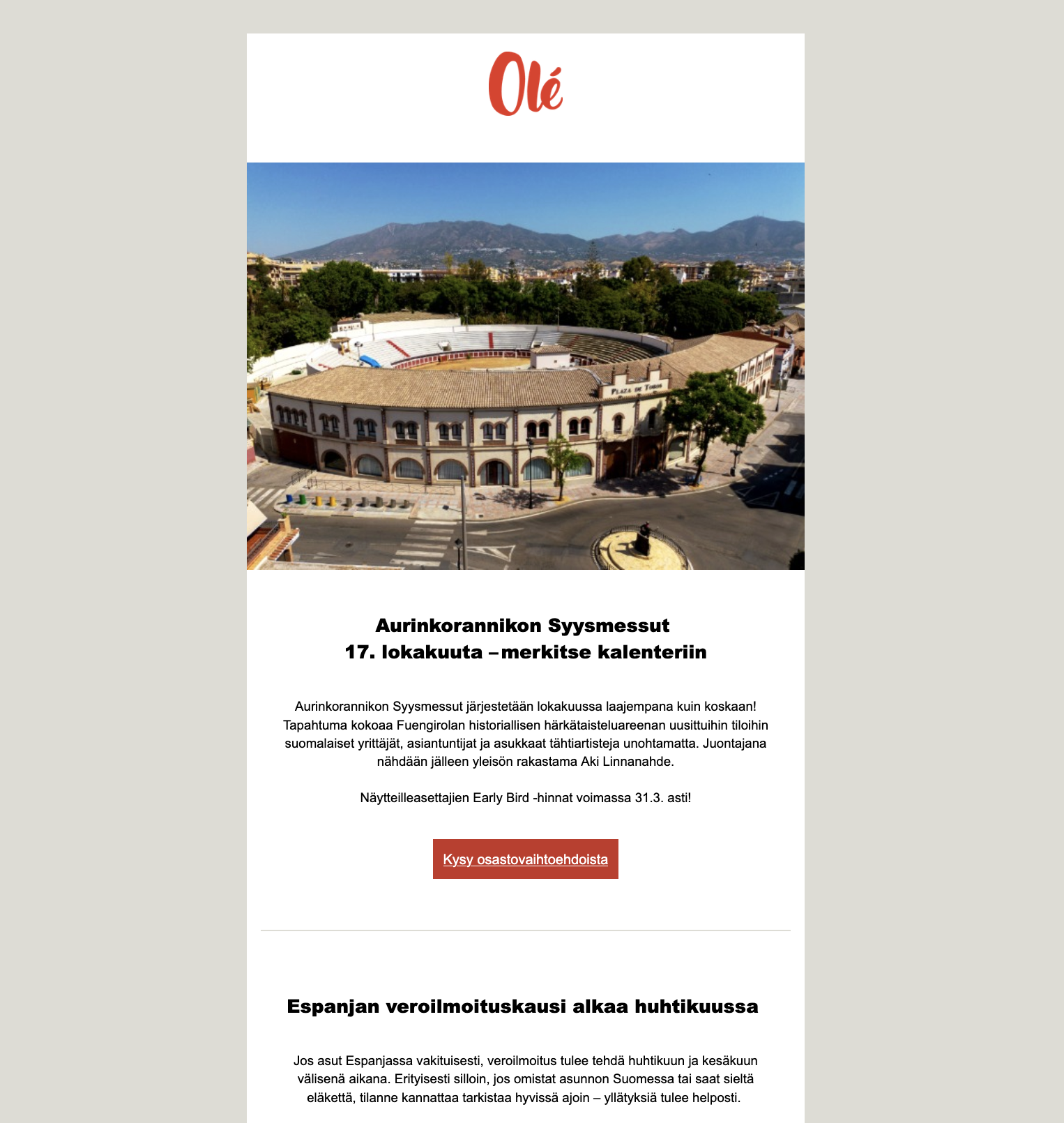 Pysy ajan tasalla Espanjan ajankohtaisista asioista suomeksi. Lähetämme kirjeen neljä kertaa vuodessa – luvassa käytännön tietoa asumisesta ja elämisestä Espanjassa, inspiraatiota matkailuun sekä tietoa Olén tapahtumista.
